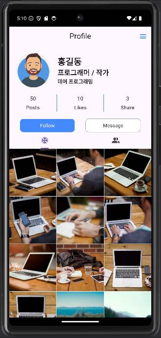 이 블로그 포스팅에서는 Flutter를 이용해 프로필 페이지를 구현하는 방법을 설명합니다. 각 섹션을 나누어 테마 설정부터 프로필 헤더, 버튼, 그리고 탭을 사용하는 방식까지 순차적으로 구성해보겠습니다.1. 앱 테마 설정하기 (theme.dart)앱의 테마는 전체 디자인에서 중요한 부분을 차지합니다. Flutter에서는 ThemeData 클래스를 사용하여 앱의 테마를 설정할 수 있습니다. 이를 통해 색상, 글꼴, 위젯 스타일 등을 일관되게 적용할 수 있습니다.import 'package:flutter/material.dart';// 보통 협업 --> 디자이너// 전역 함수로 만들어 보자.const MaterialColor primaryWhite = MaterialColor( 0xFFFFFFFF, // ..